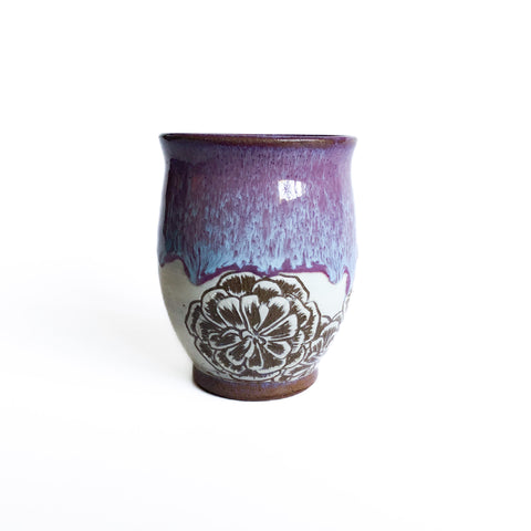 Tournée et gravée à la main par un artisan local, cette tasse d'inspiration japonaise est décorée d'un motif de fleurs évoquant les oeillets d'Inde. Une attention particulière a été porté à la glaçure rose accentuée de bleu et d'opale afin de lui donner cet effet figé dans le temps. Elle accompagne à merveille une théière contemporaine ou traditionnelle japonaise.